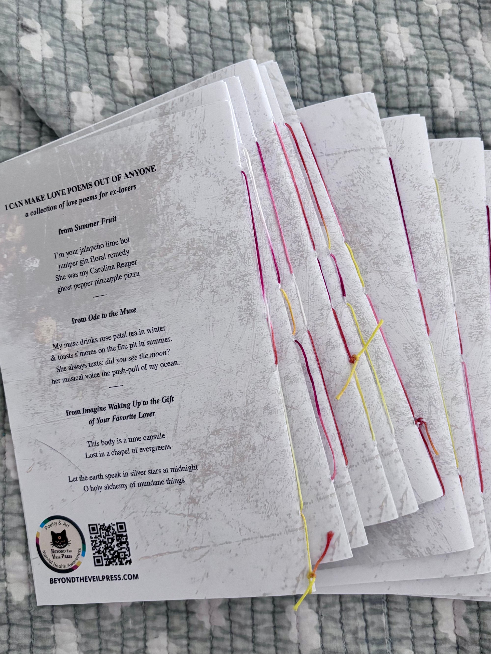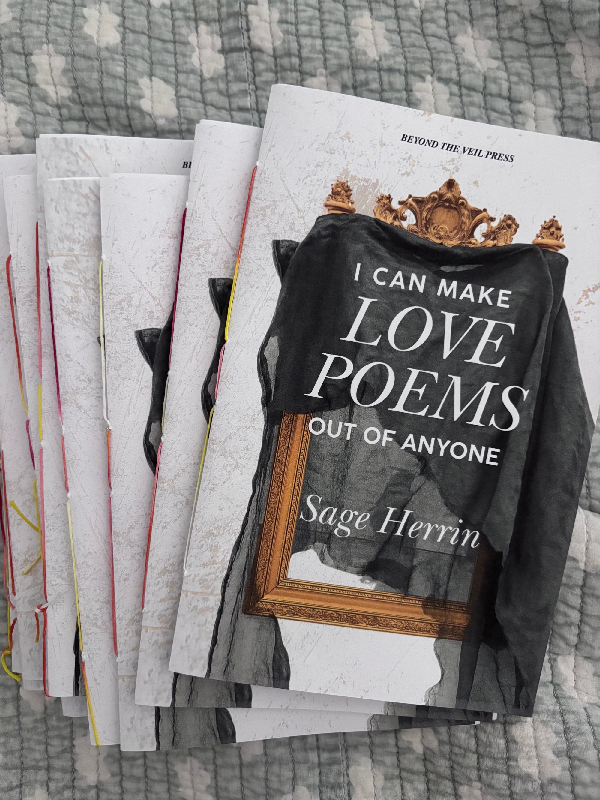 ✨ New Release ✨ Fresh off the press: I Can Make Love Poems Out of Anyone — a hand-bound zine of refreshed and brand-new poems by Sage Herrin. This collection is for ex-lovers, born from heartbreak and reshaped into pieces that are tender, playful, nostalgic, and a little bit sexy. Each copy is hand-stitched with neon thread and numbered by the author. Only 10 copies available.